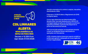 A CDL Linhares alerta os empresários, especialmente os MEIs, sobre uma importante mudança nas regras do ICMS no Espírito Santo. Com a entrada em vigor do Decreto nº 6.335-R, determinados Microempreendedores Individuais passam a ser obrigados a obter inscrição estadual junto à SEFAZ-ES, além de cumprir obrigações fiscais nas operações com mercadorias. A medida já está em vigor desde 01/04/2026 e exige atenção dos empreendedores enquadrados nas atividades especificadas. A CDL orienta que os empresários busquem suporte contábil ou jurídico para garantir a adequação às novas exigências e evitar irregularidades.